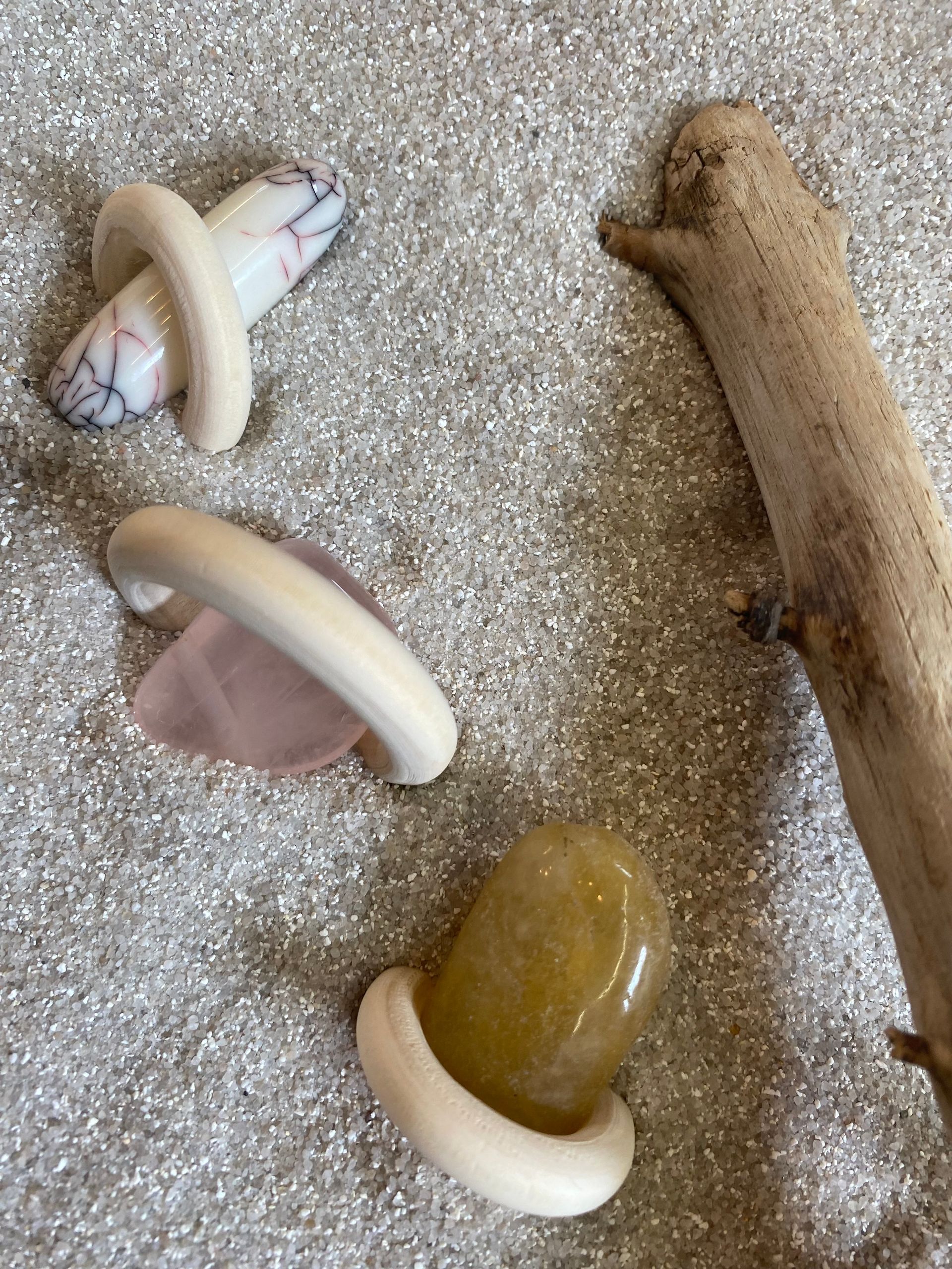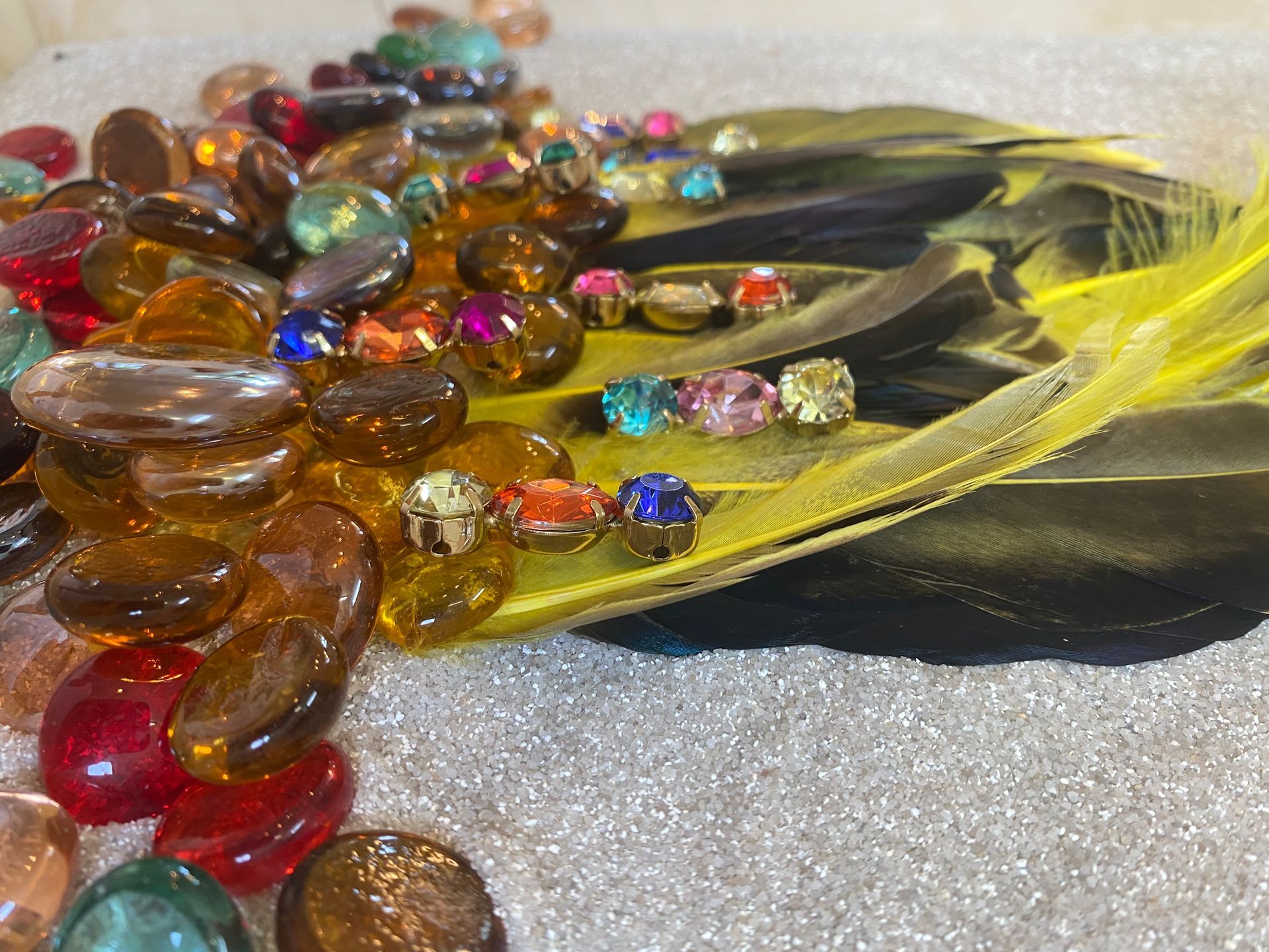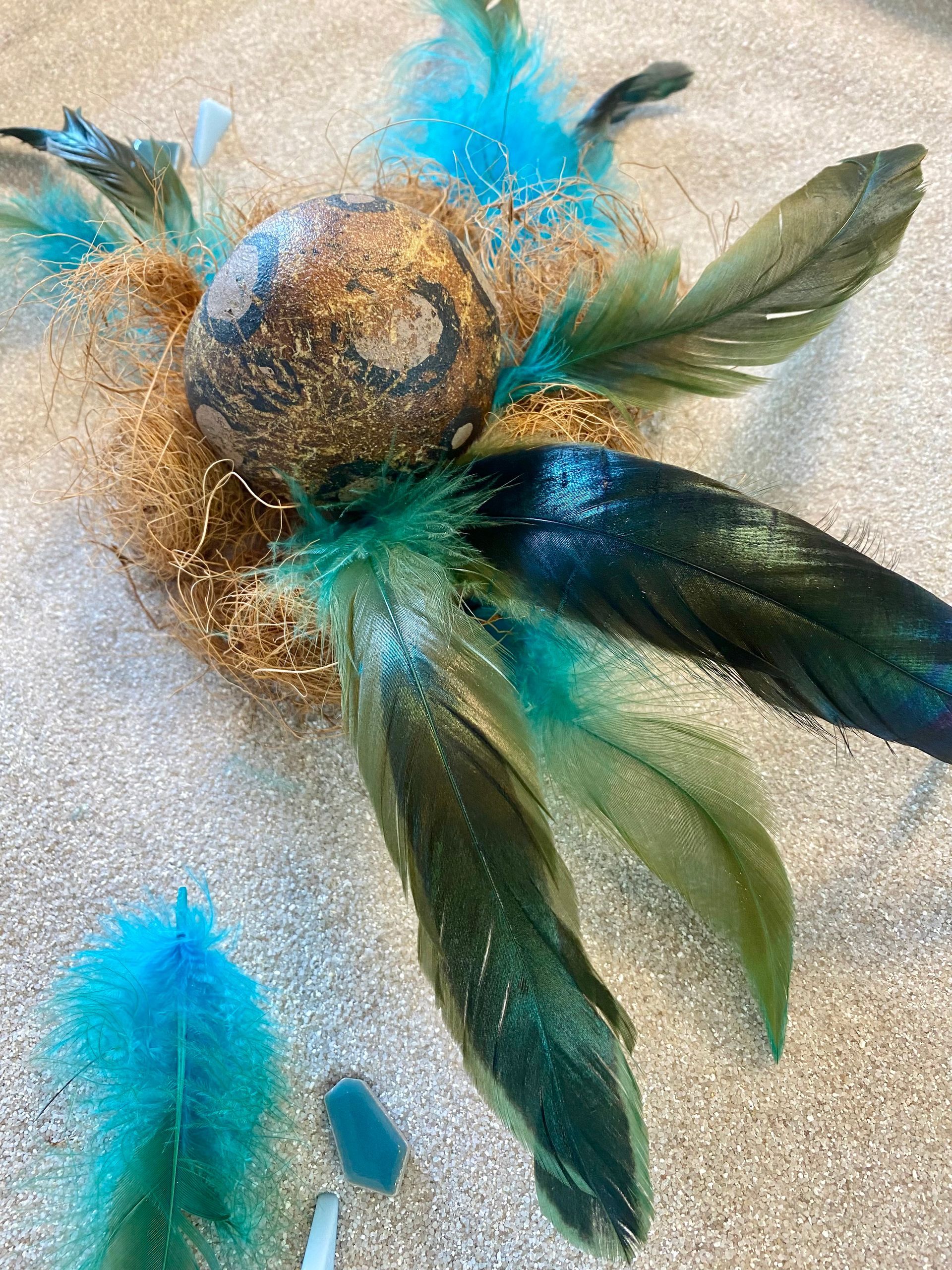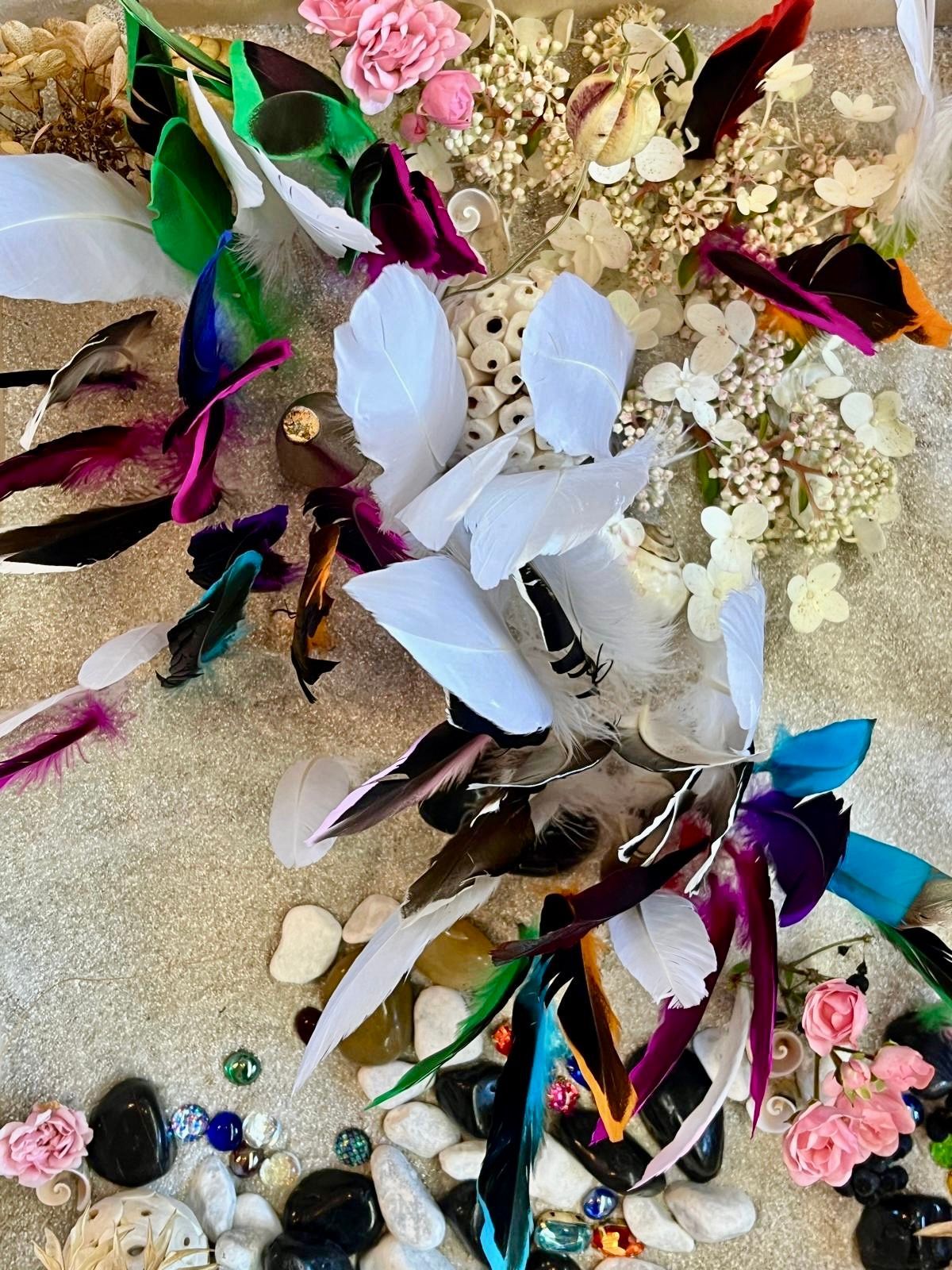 Edelsteine, Glassteine, Naturmaterialien wie Holz, Pflanzen, Muscheln, verschiedene Steine, Schneckenhäuser, Skulpturen, Stoff, Bänder,Federn uvm.